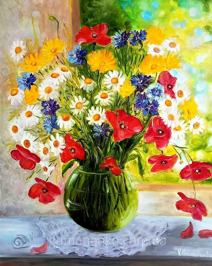 Картина "Полевые цветы в стеклянной вазе ", холст 50х60 см., масло.
