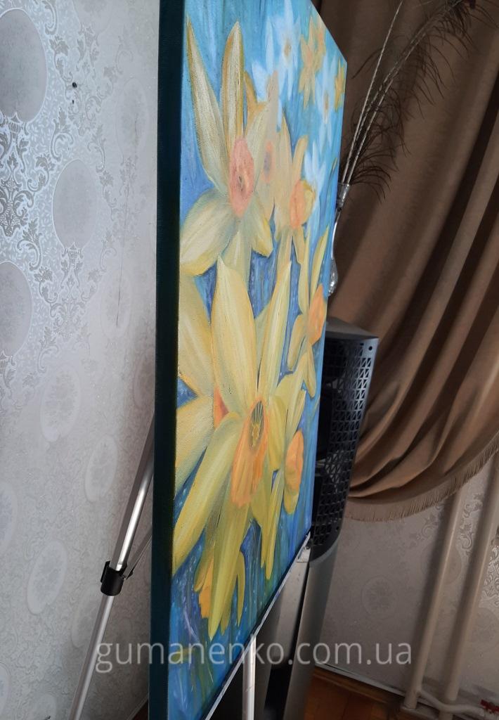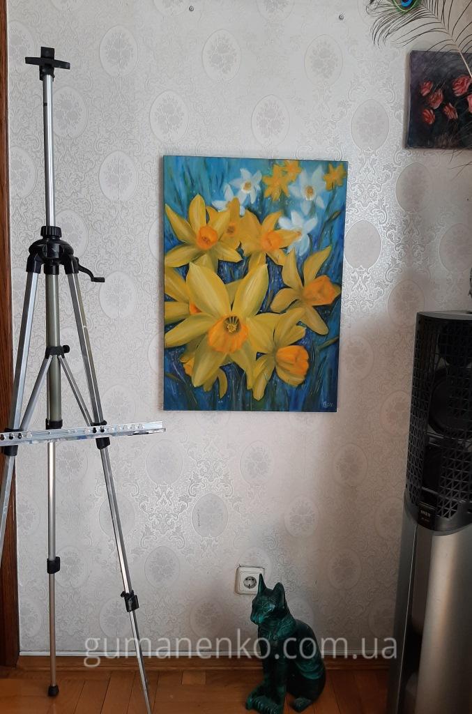 Желтые нарциссы на голубом фоне – это яркая и солнечная картина, наполненная контрастом теплых и холодных оттенков. Нежные желтые нарциссы, символ весны и возрождения, выделяются на спокойном голубом фоне, создавая гармоничную композицию. Работа выполнена в технике масляной живописи, благодаря чему цветы кажутся живыми и объемными. Эта картина прекрасно впишется в интерьер, добавив в него свежести и света. Идеальный выбор для тех, кто ищет уникальное произведение искусства для украшения дома или офиса.