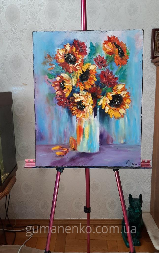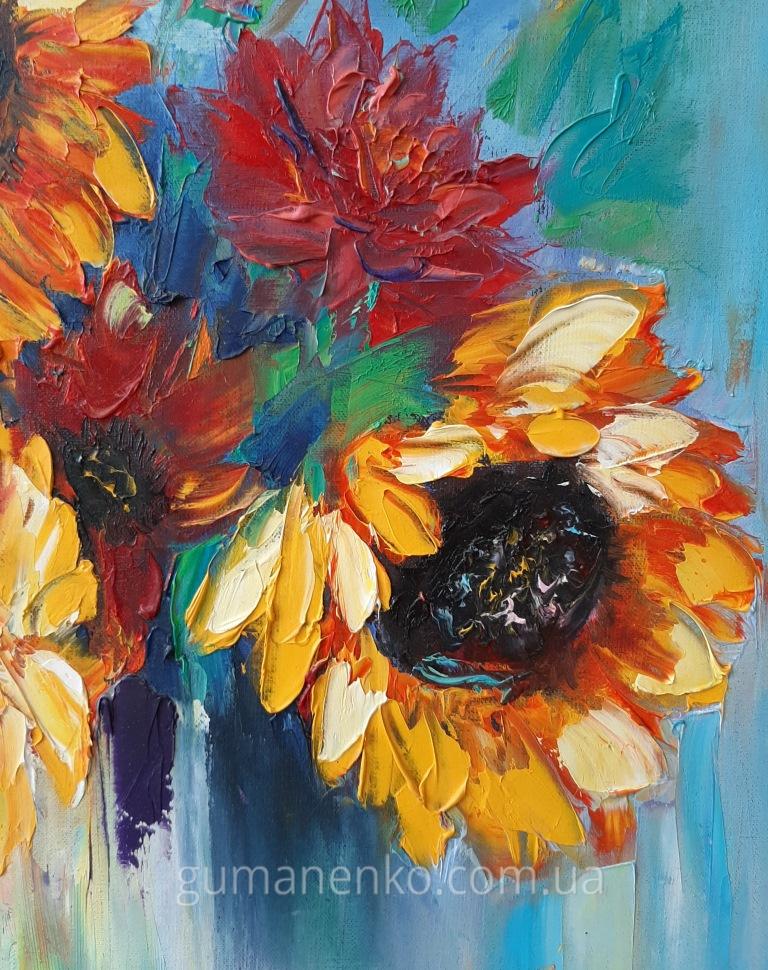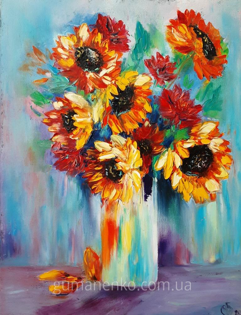 Картина маслом "Подсолнухи" – яркое и фактурное произведение, передающее солнечную энергию и жизнерадостность. Подсолнухи, выполненные с помощью мастихина, приобретают объем и динамику, делая композицию живой и выразительной. Густые мазки масла придают цветам уникальную текстуру, благодаря которой они буквально оживают на холсте. Эта картина станет центром внимания в любом интерьере, наполняя пространство теплом и светом.