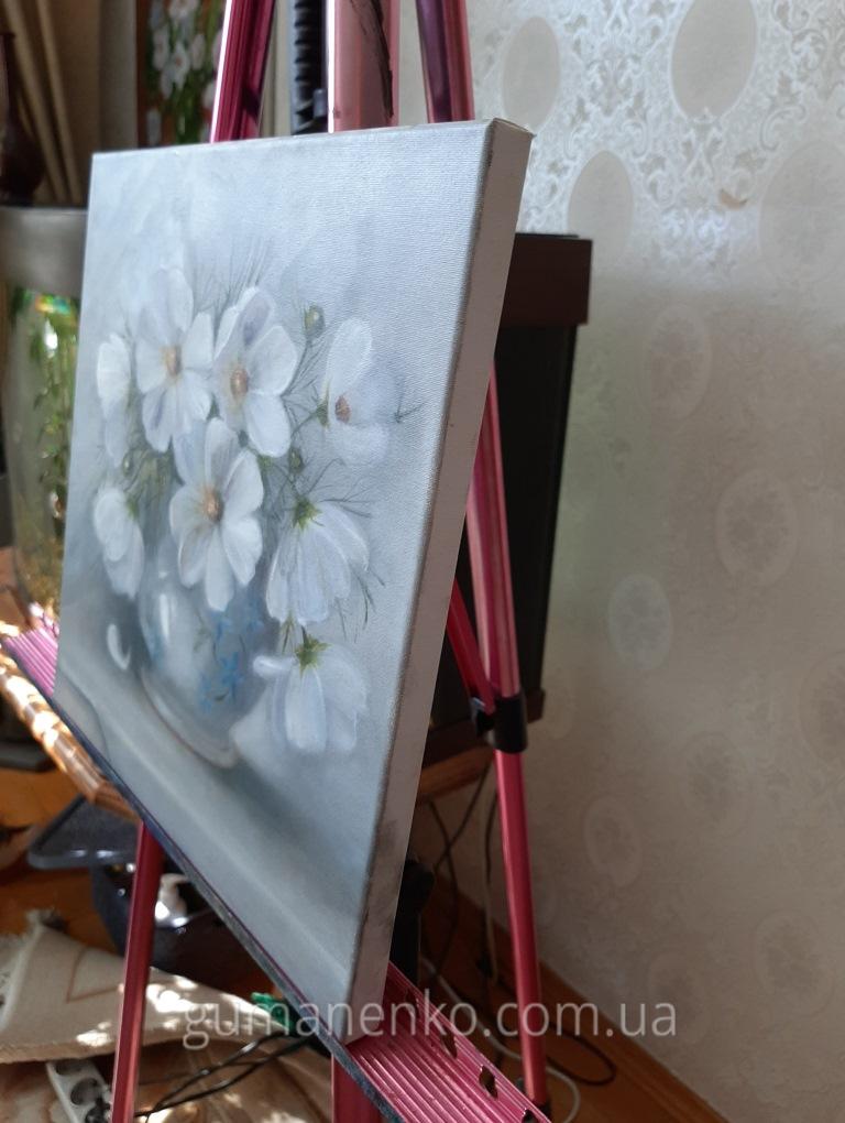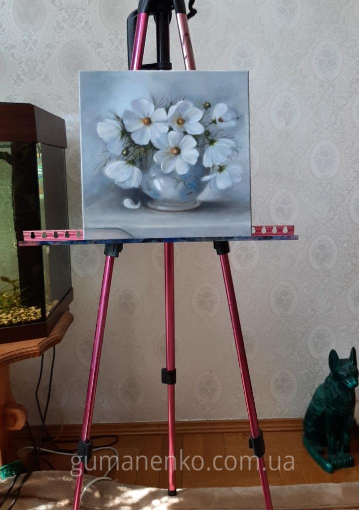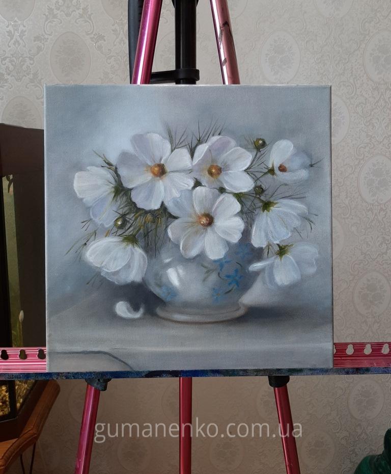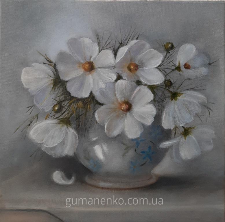 Картина маслом "Белые космеи" изысканная работа, выполненная в технике масляной живописи. Нежные белые цветы космеи, изображенные на холсте, олицетворяют чистоту и природную гармонию. Каждая деталь картины передает легкость и красоту этих цветущих растений, создавая атмосферу спокойствия и уюта. Это произведение искусства прекрасно дополнит любой интерьер, добавив ему свежести и элегантности.